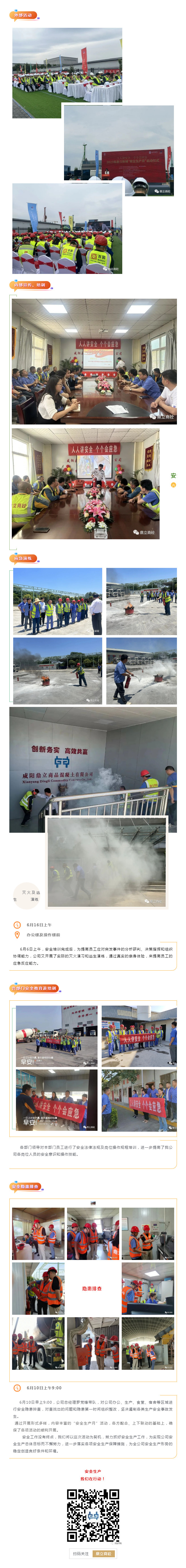 2023年6月是第22個“安全生產(chǎn)月”,我公司圍繞主題“ 人人講安全 個個會應(yīng)急”,并結(jié)合秦漢新城的各項具體措施和要求,組織開展了各項豐富多彩的“安全生產(chǎn)月”活動。